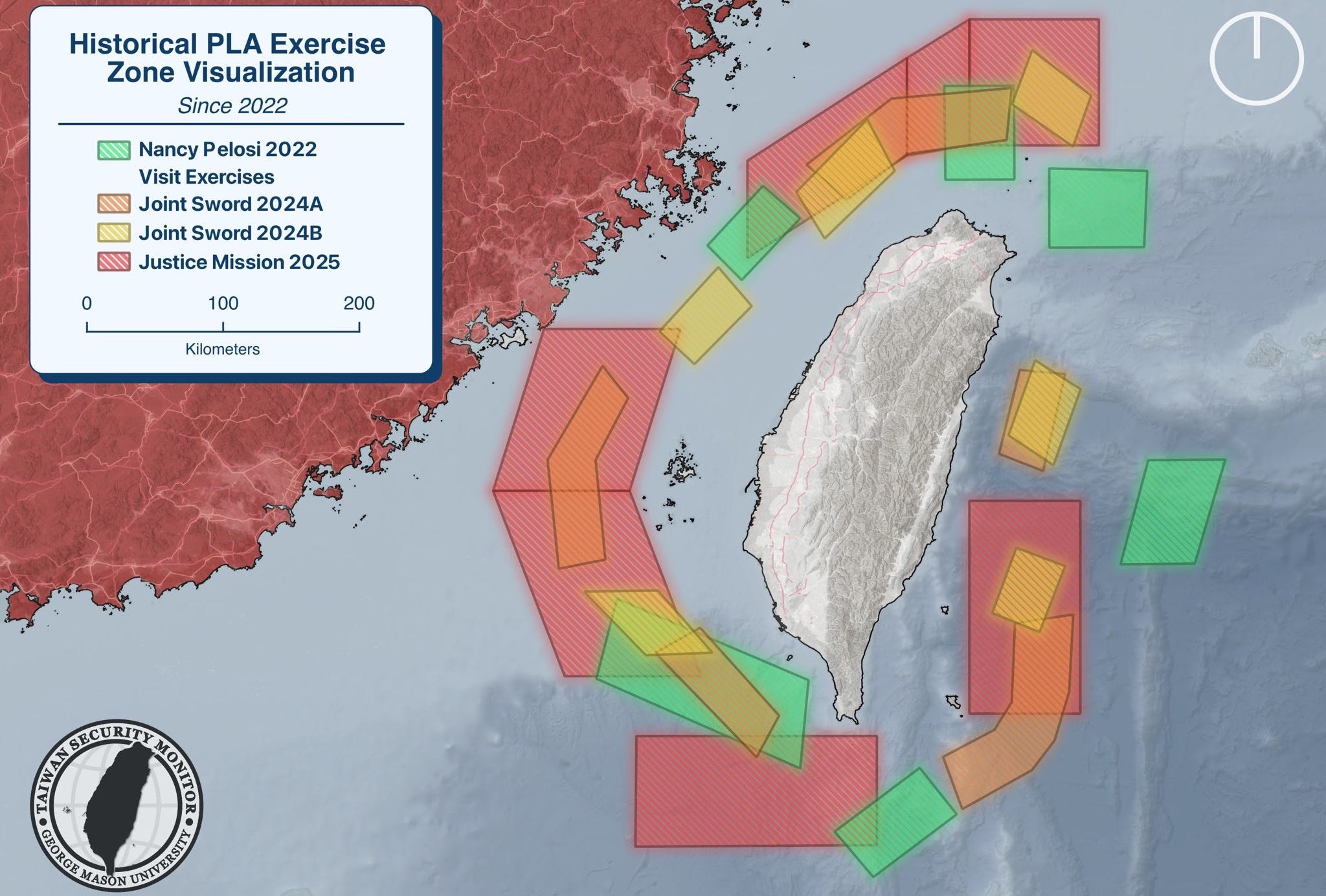 O Exercício Missão Justiça 2025 ocorreu em vários locais ao redor de Taiwan. Como demonstra o mapa abaixo, esses locais correspondem a áreas onde uma futura campanha chinesa para subjugar Taiwan concentraria muitas de suas operações aéreas e navais. As zonas norte, leste e sul corresponderiam a áreas onde o Exército Popular de Libertação (EPL) poderia conduzir operações de "escudo" para impedir que ajuda militar estrangeira chegasse a Taiwan. As zonas oeste e noroeste correspondem a zonas de trânsito para quaisquer frotas de invasão aérea e marítima, que precisariam ser protegidas pelo EPL.